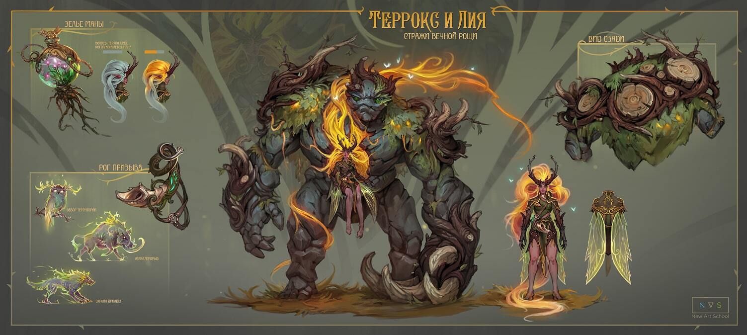 —Ну, изначально я наткнулся, мне понравилась очень тема, можно много чего придумать на такую тему. Я решил поучаствовать. Сначала я подумал, какую стихию взять. Почему-то Земля мне показалась какой-то более перспективной, как будто бы какая-то разнообразная, что ли, сочетает много в себе материалов. И вот что-то сразу я ее взял и сразу подумал, что я почему-то хочу два персонажа. Ну, как бы два в одном. Какой-то такой сильный контраст сделать между этими персонажами. Что-то очень грубое и что-то очень мягкое. Вот. И из этого какие-то идеи у меня вытекали. Три скетча я нарисовал. Выбрал вот в итоге вот этот, с дриадой. Где она как сердце, наверное, внутри у этого голема, оживляет его. А этот голем её защищает. Какая-то такая идея была.